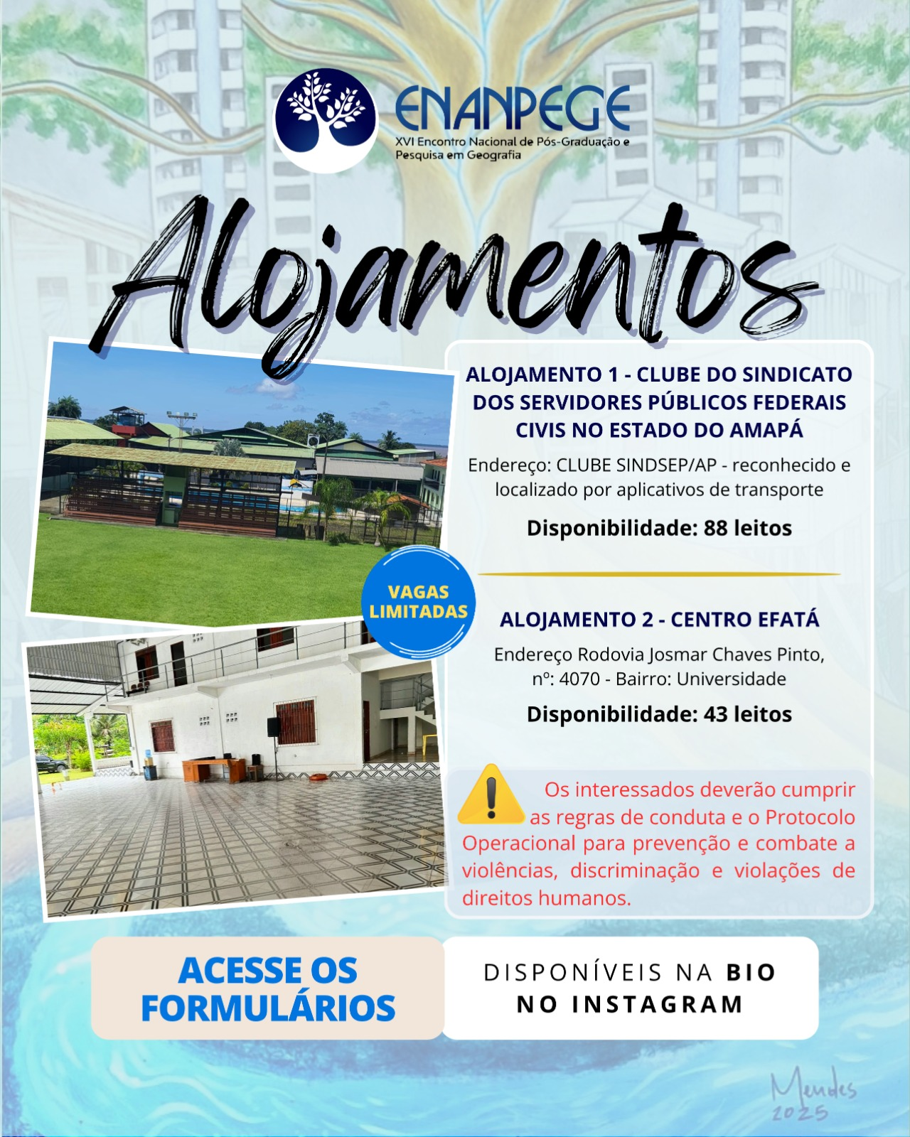 ALOJAMENTO 1 – Clube do Sindicato dos Servidores Públicos Federais Civis no Estado do Amapá – SINDSEP/AP Endereço: CLUBE – SINDSEP/AP (local reconhecido por aplicativos de transporte) Disponibilidade: 88 leitos Quartos: duplos Valor: R$ 85,00 por dia (por pessoa) Café da manhã: não incluso Formulário de inscrição:https://forms.gle/xXcwH2NRXSy8MArF9